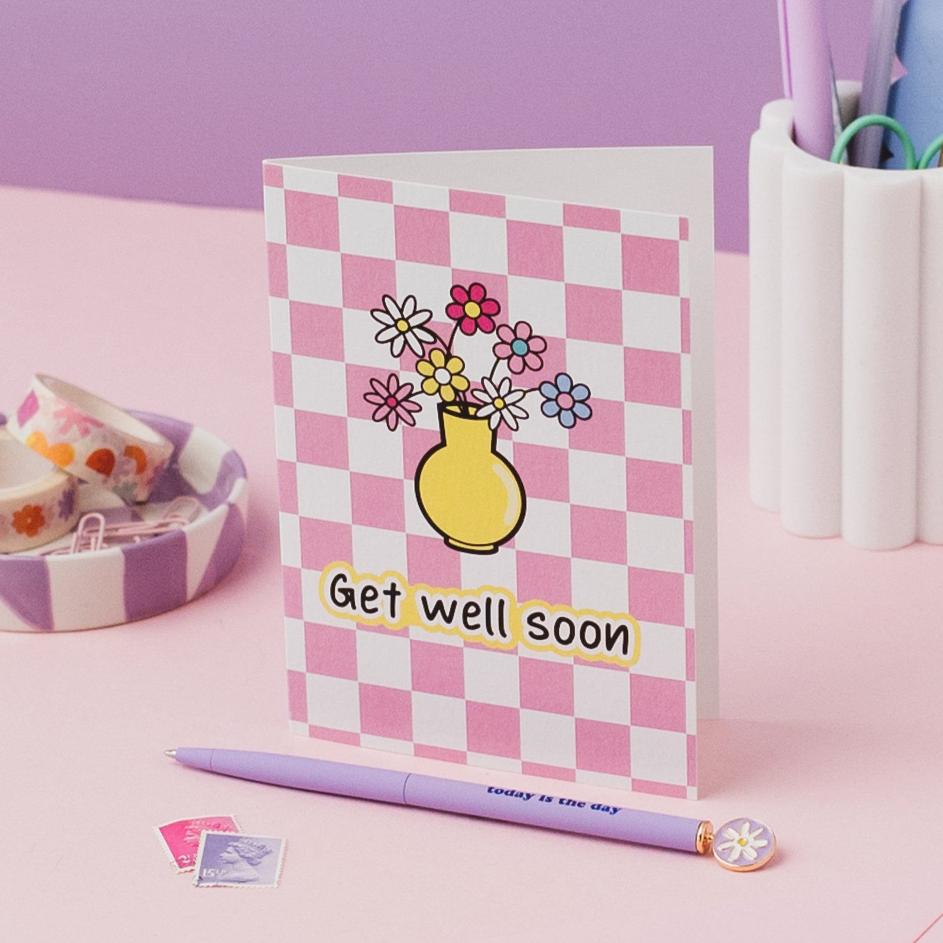 Send some floral love with our cute Get Well Soon Card. Featuring a pink check design and a colourful vase of flowers, this card will brighten up anyone's day. Don't forget the light pink envelope for an extra touch of cuteness.