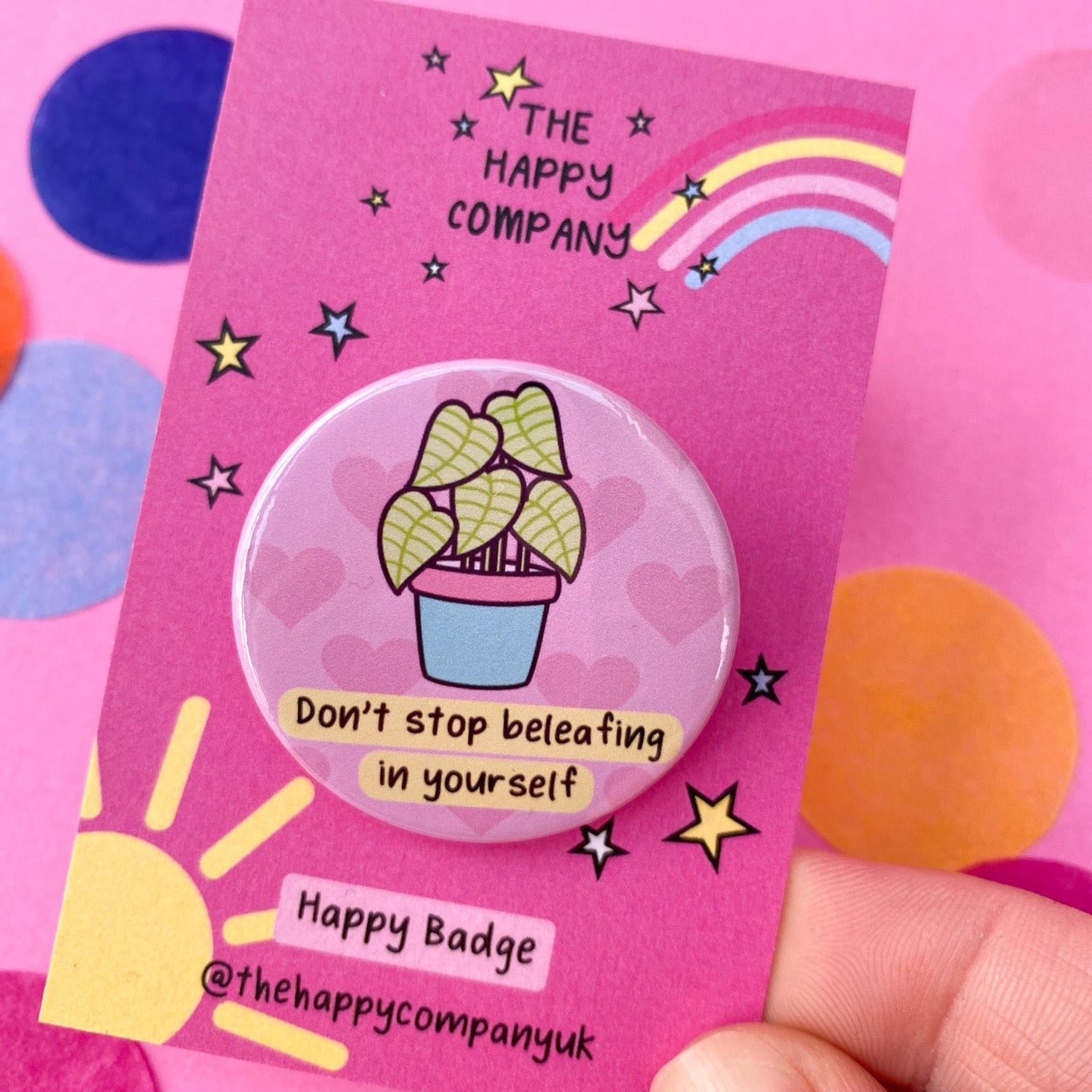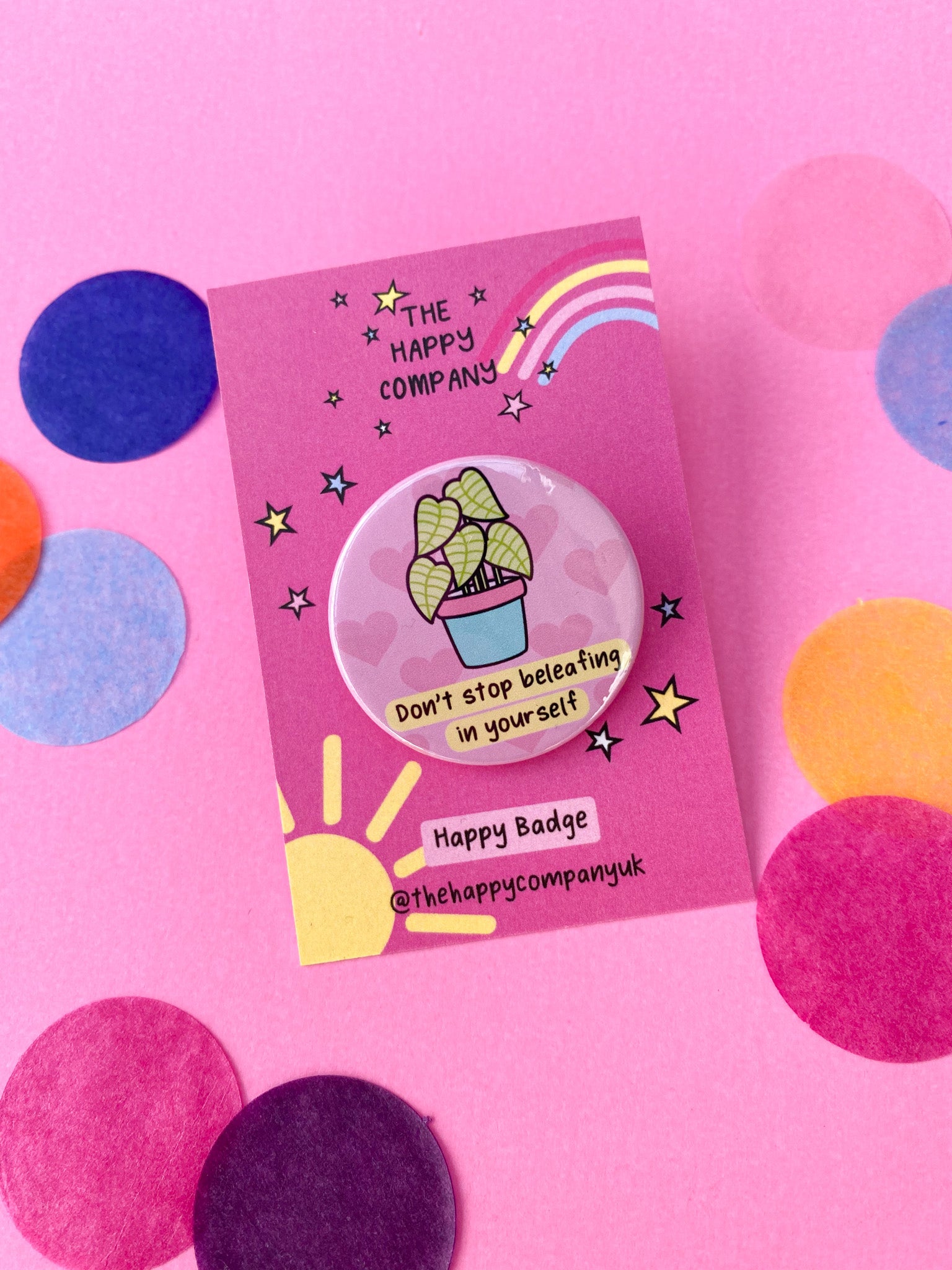 Make a statement and don't stop "beleafing" in yourself. This 38mm pin badge is perfect for a subtle reminder to keep your head up and stay focused on the positive. A great mental health gift and motivational reminder for anyone looking for an extra boost of self-confidence.