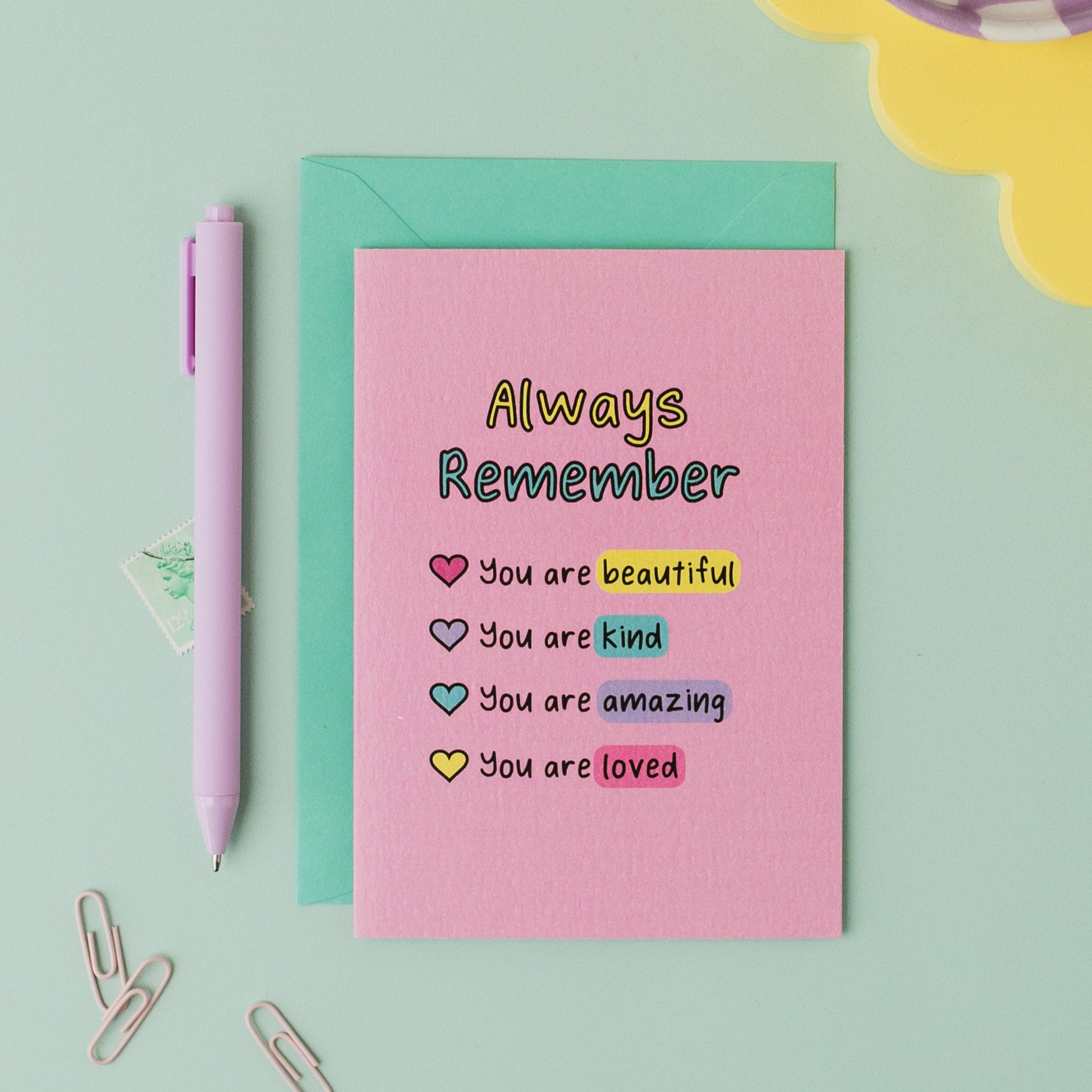 Unleash positivity with the Always Remember Affirmation Card. In a vibrant pink hue, this card comes with a turquoise envelope for a charming touch. Spread joy and good vibes with every thoughtfully written message.