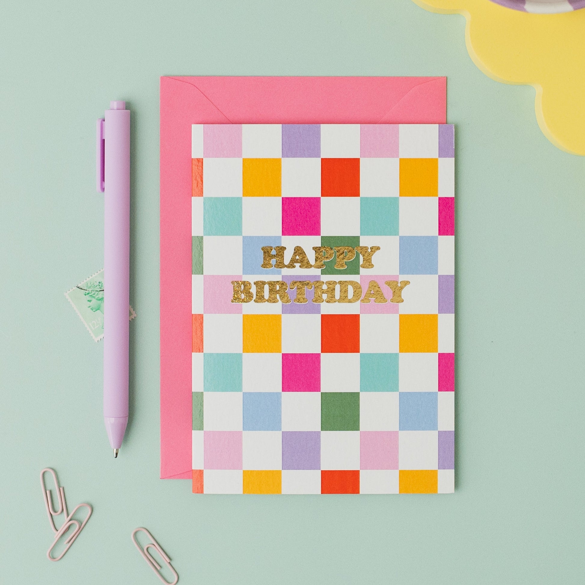 Celebrate in style with our Colourful Check Birthday Card! Featuring vibrant hues and a touch of gold foil, this card is sure to stand out. Comes with a pretty pink envelope for a complete and stylish package. Send birthday wishes with a pop of colour!