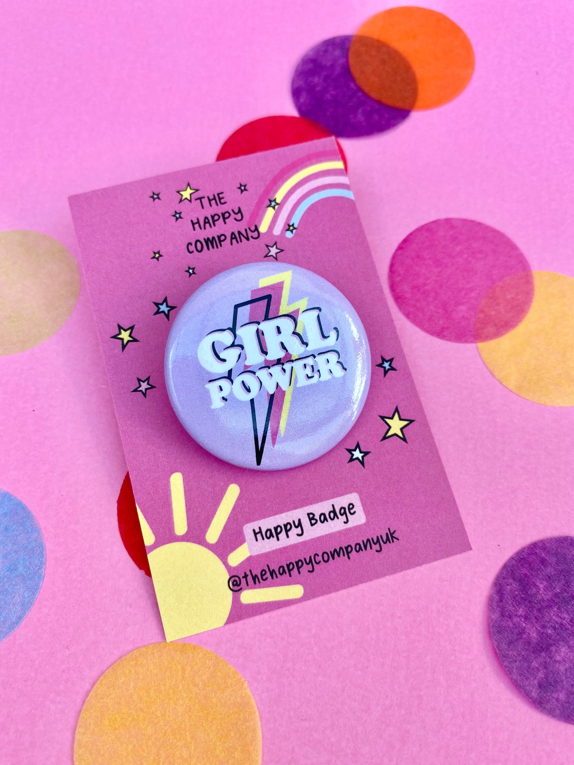 Our badge is 38mm wide with a silver long pin back, and a glossy finish on the front. Each badge is on our pink backing cards, and make the best gifts.