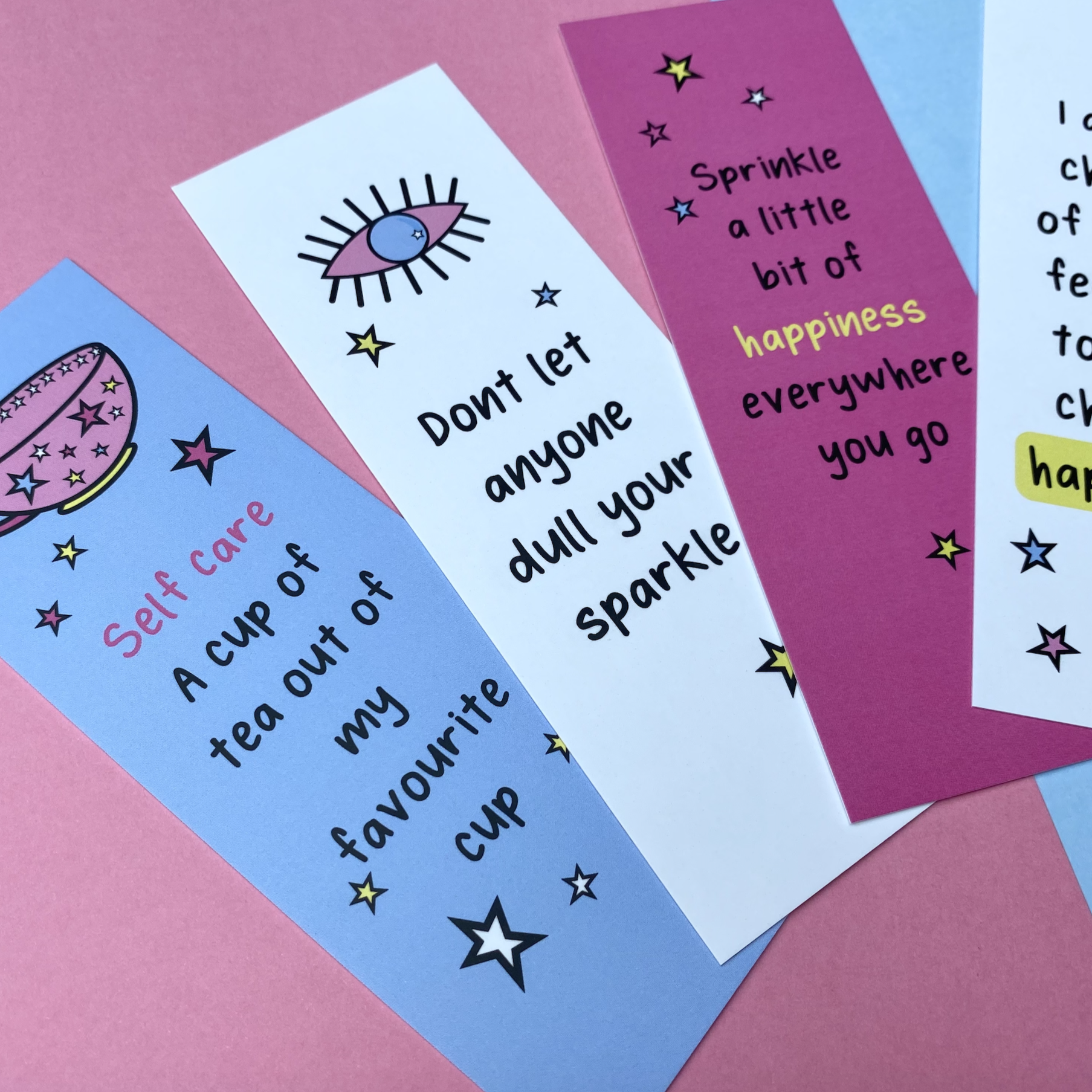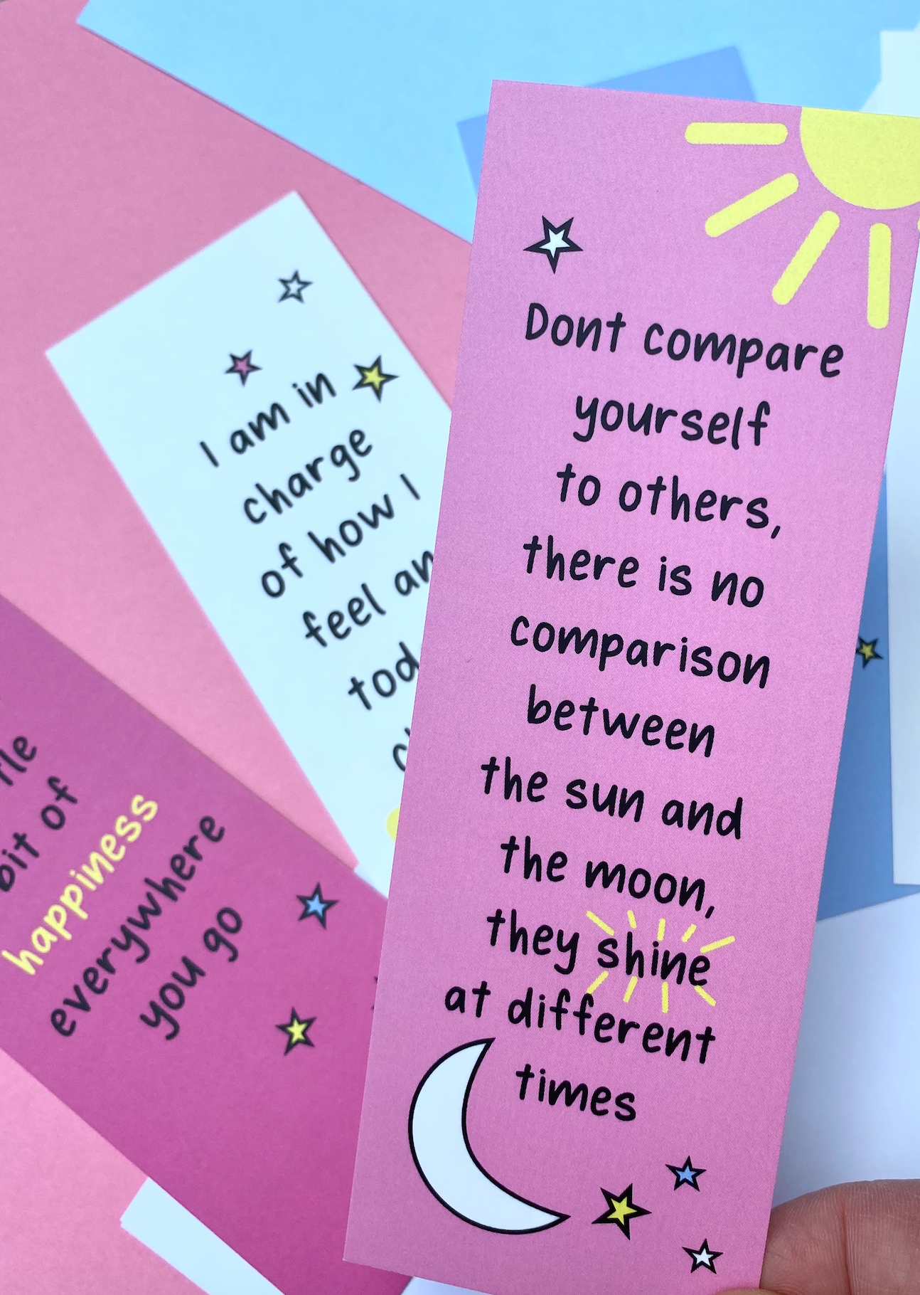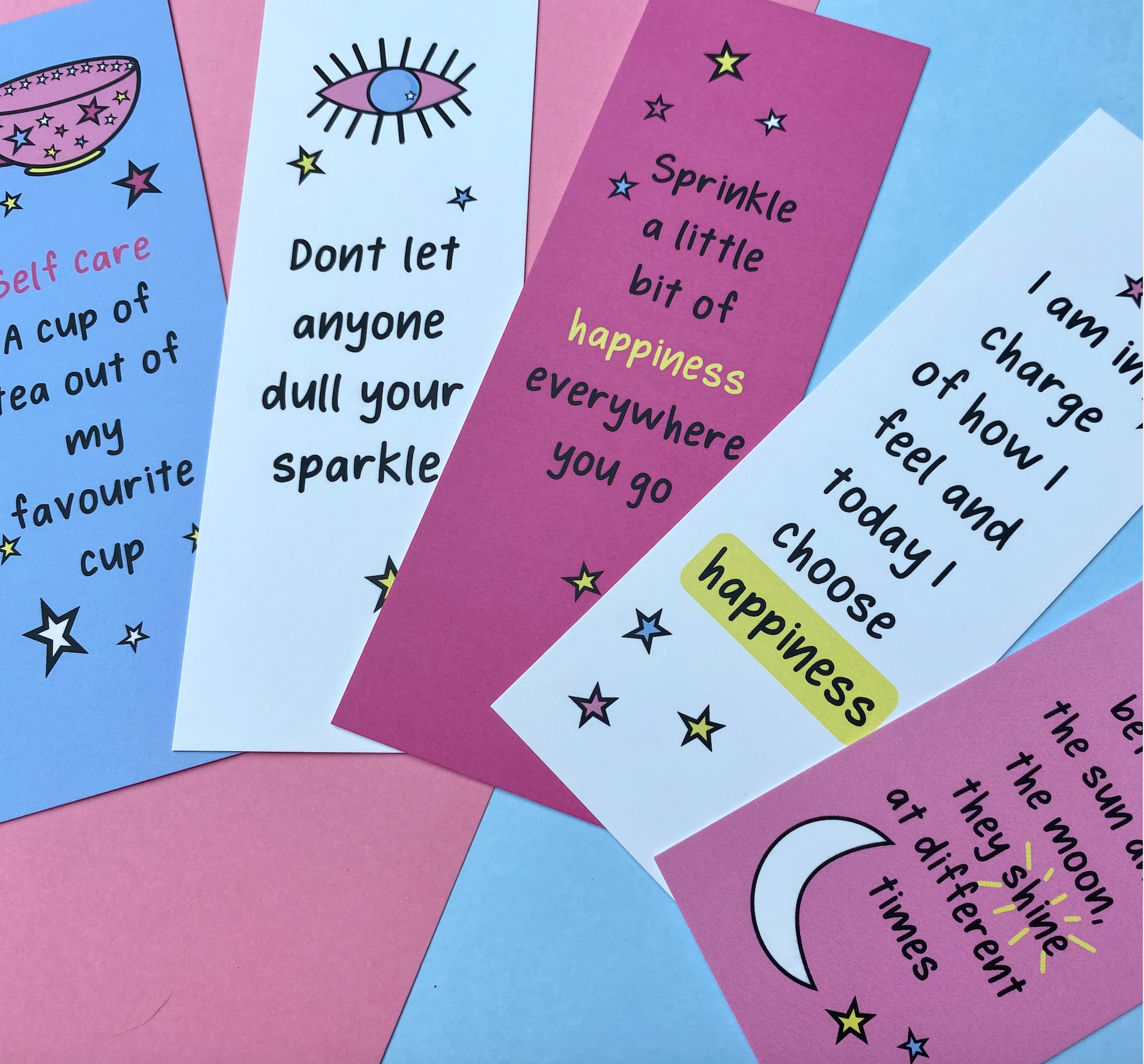 Pack of 5 bookmarks featuring different positive and self care quotes.