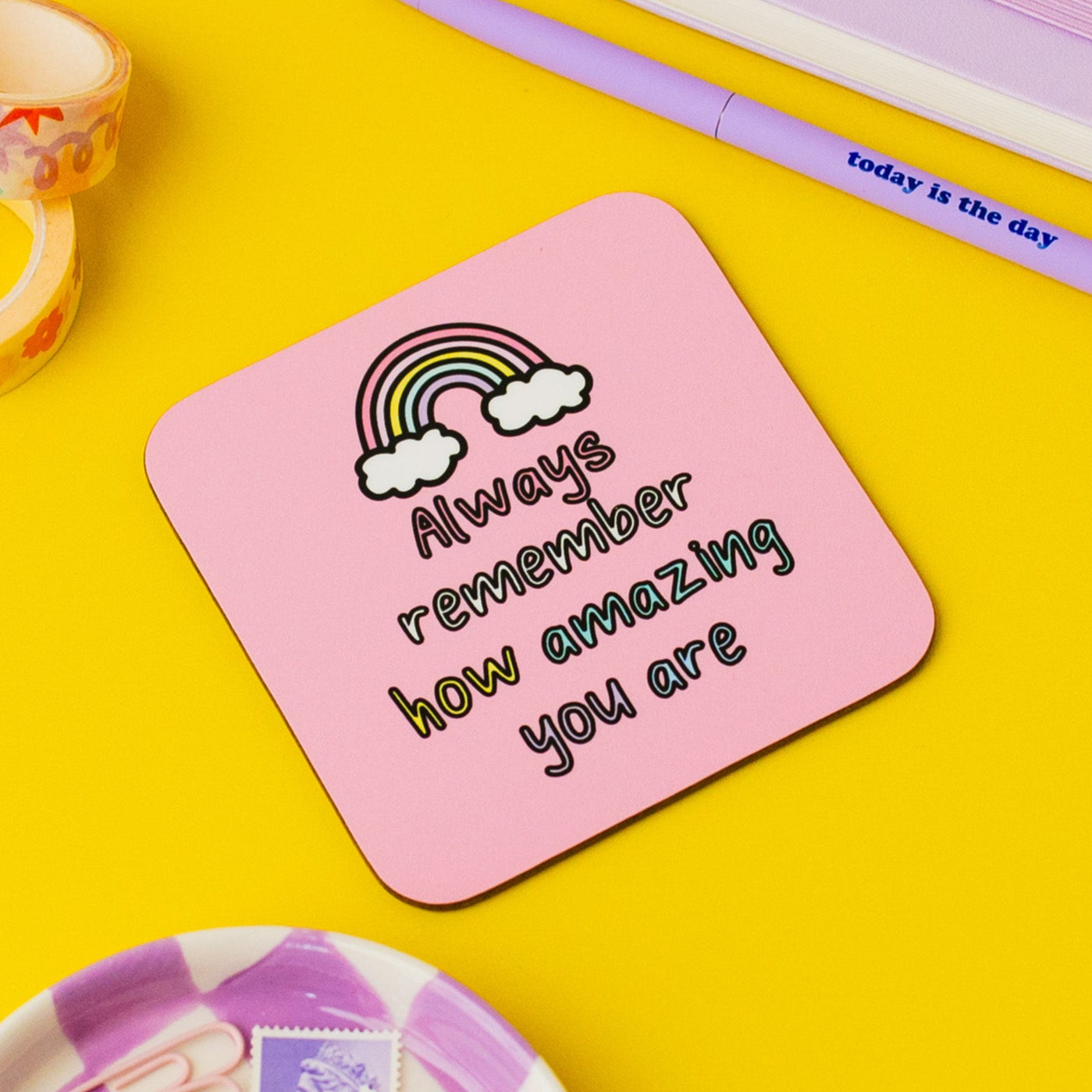 Brighten your day with this cheerful rainbow coaster! More than just a spot for your cuppa, it's a colourful reminder to "Always Remember how amazing you are." This playful piece adds a splash of positivity to your coffee table while keeping surfaces dry. Perfect for anyone who needs a little pick-me-up with their drink!
