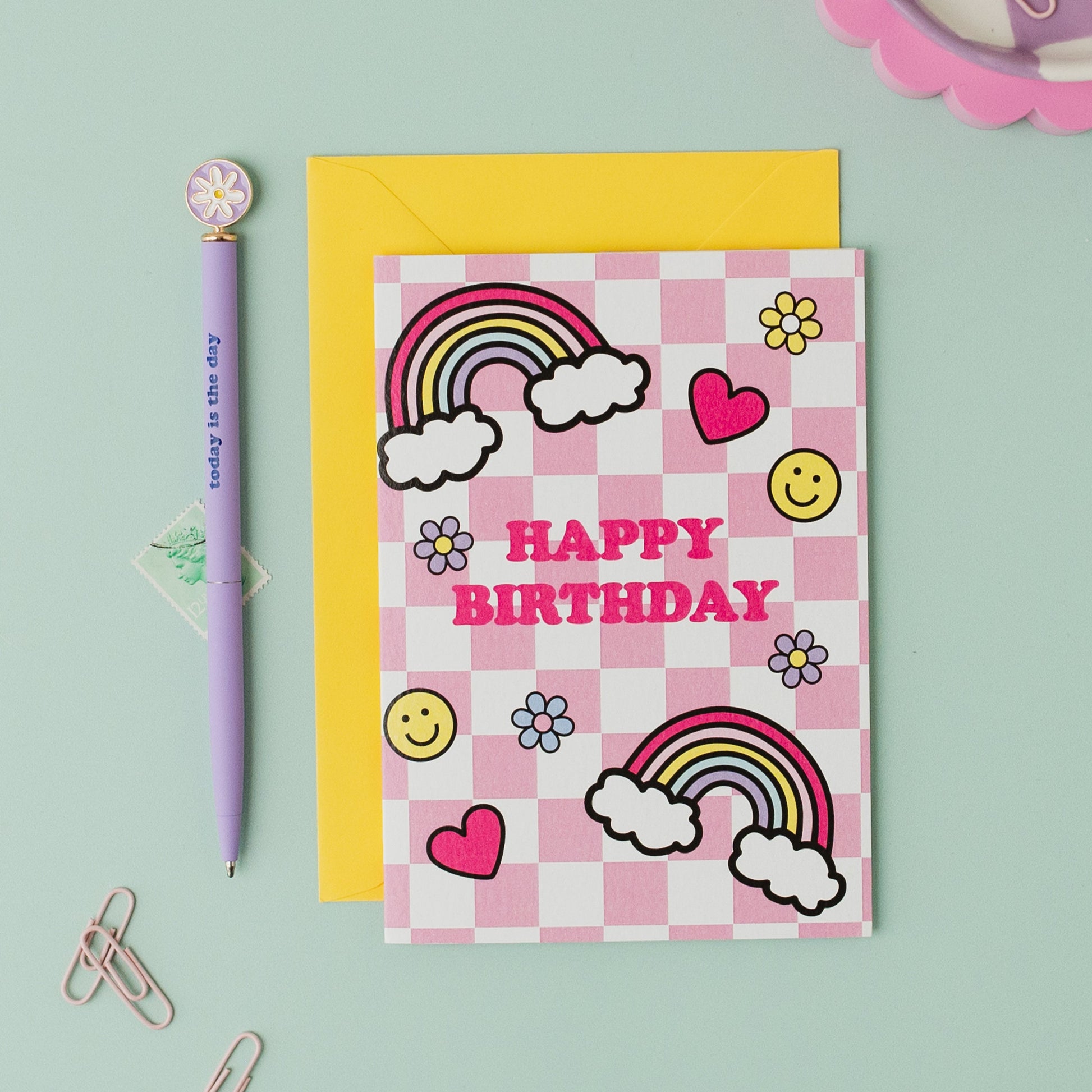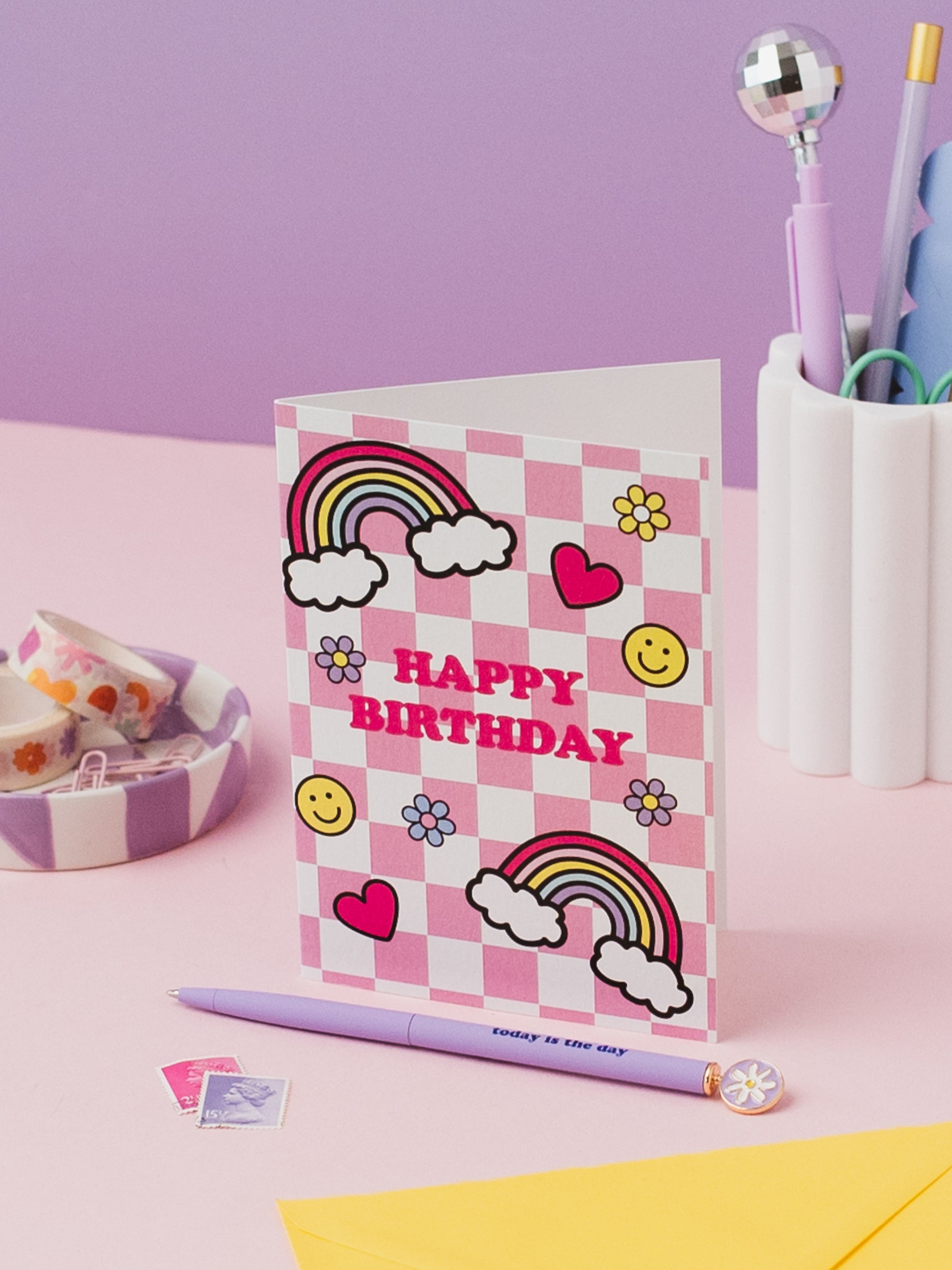 Wish a happy birthday in style with our Pink Check Doodle Birthday Card. This playful card features a unique doodle design on a pink check background, sure to make the recipient smile. Comes with a vibrant yellow envelope.ย
