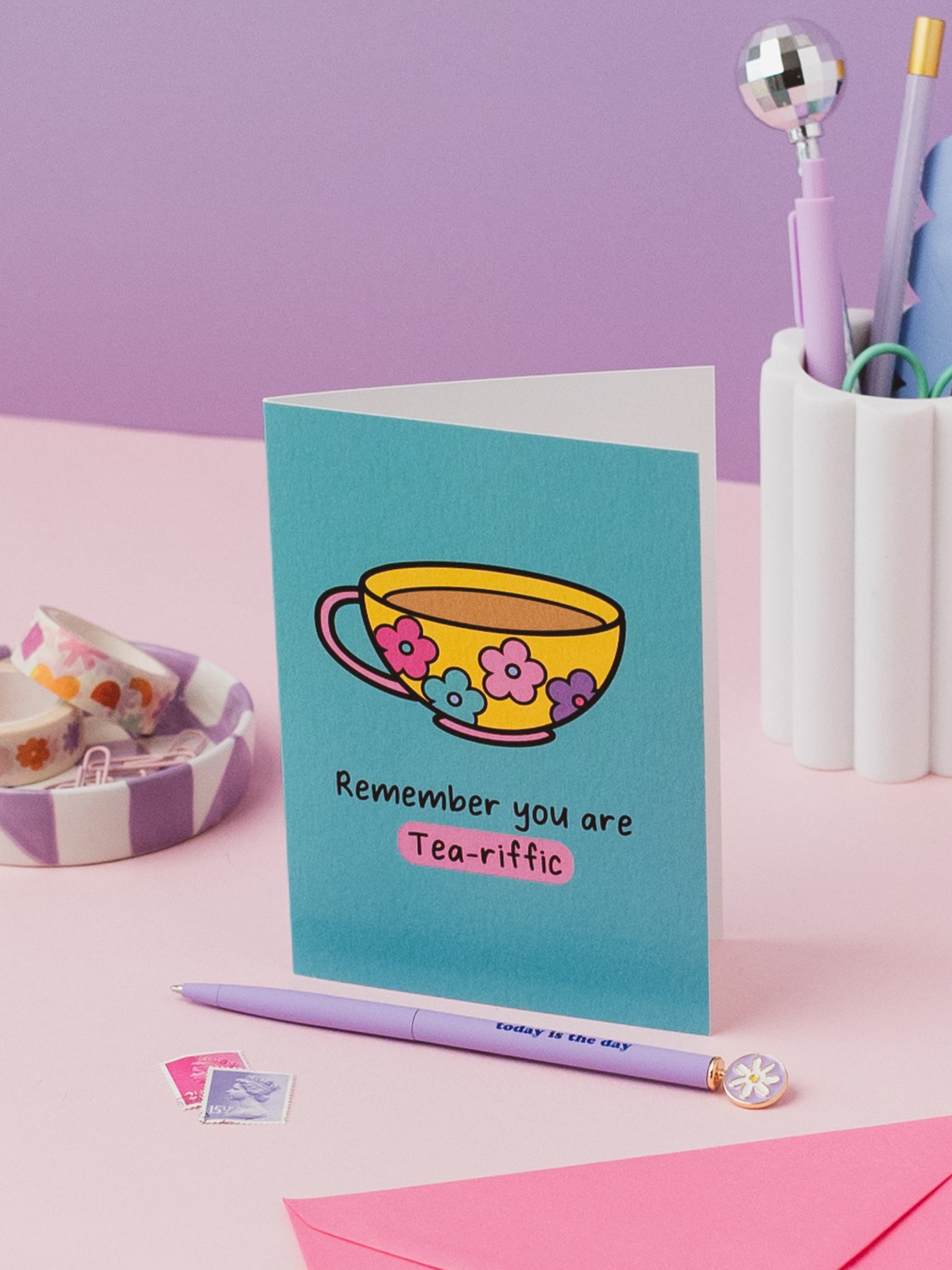 Spread some joy with our Remember You Are Tea-riffic Card! Comes with a pink envelope to secure your heartfelt message. Show someone they're tea-riffic with this playful and thoughtful card.