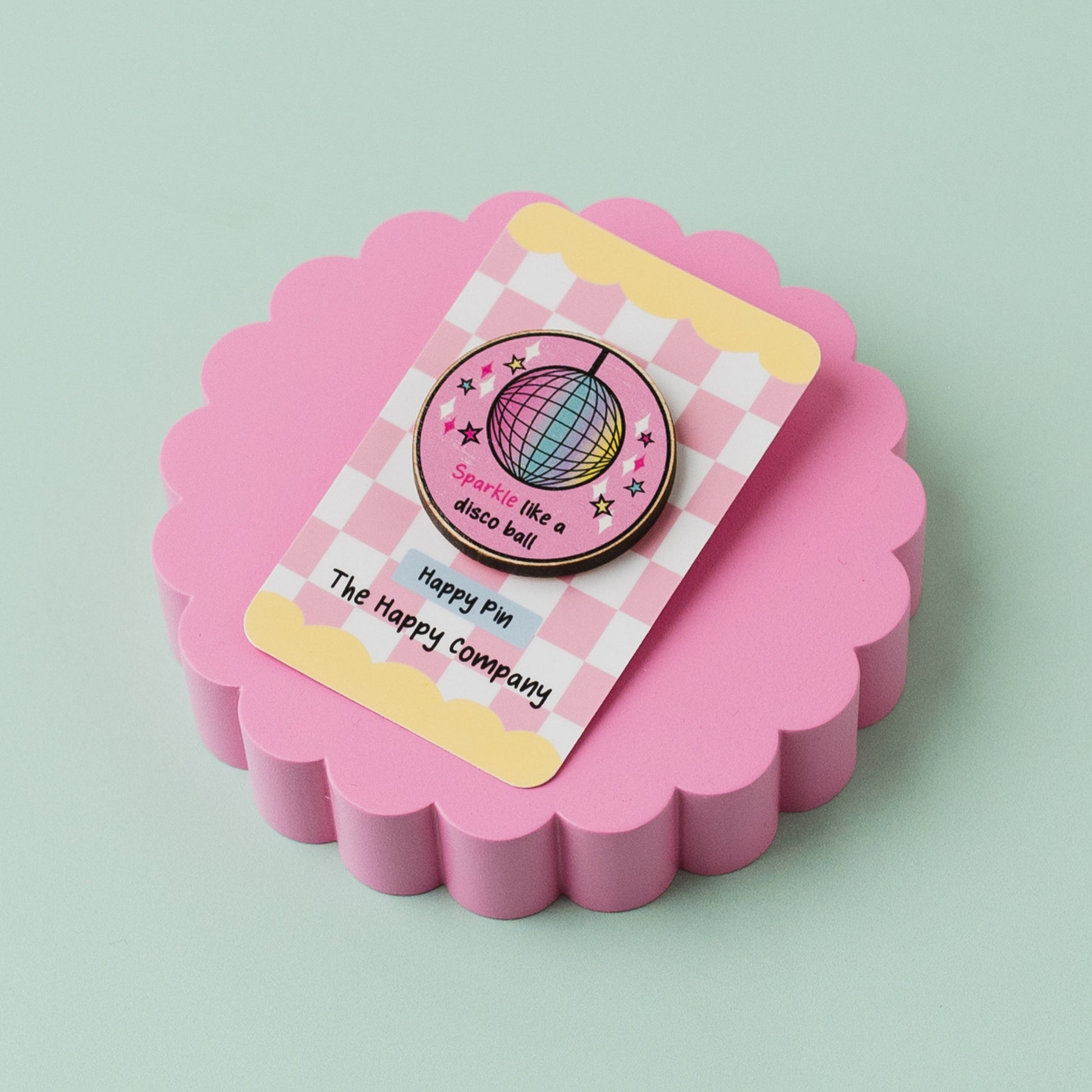 Shine bright with our Sparkle Like a Disco Ball Wooden Pin! Made from high-quality wood, this pin features a groovy disco ball design with a positive affirmation.