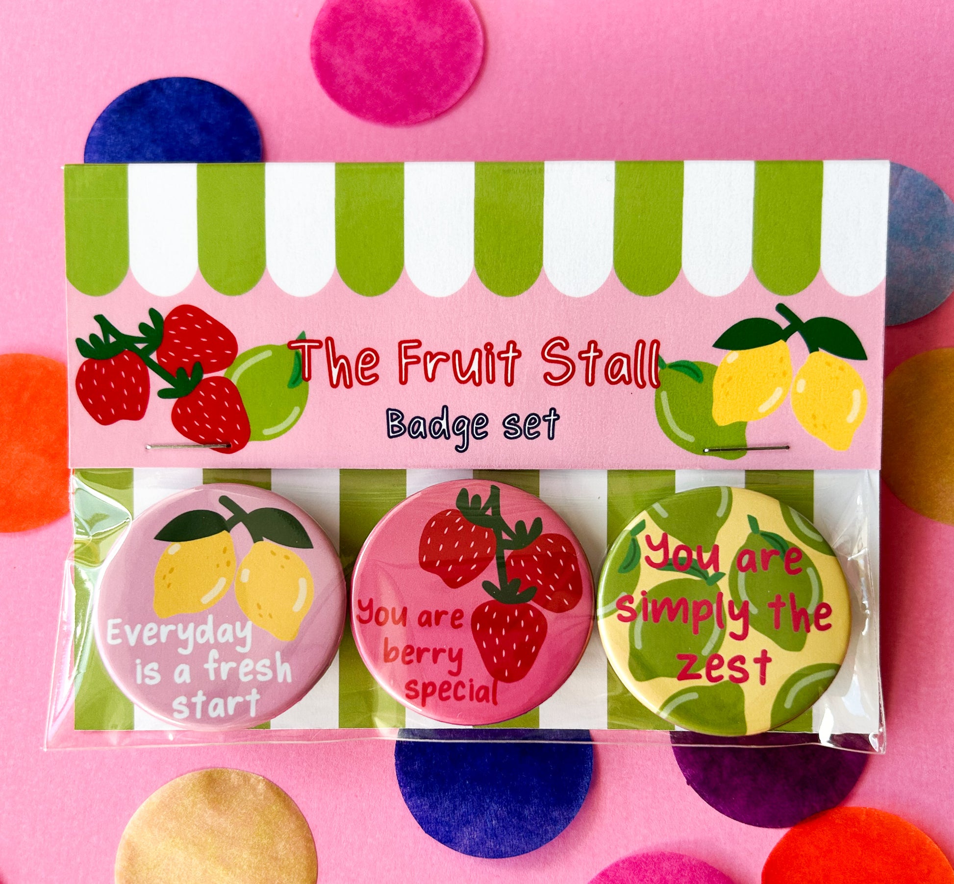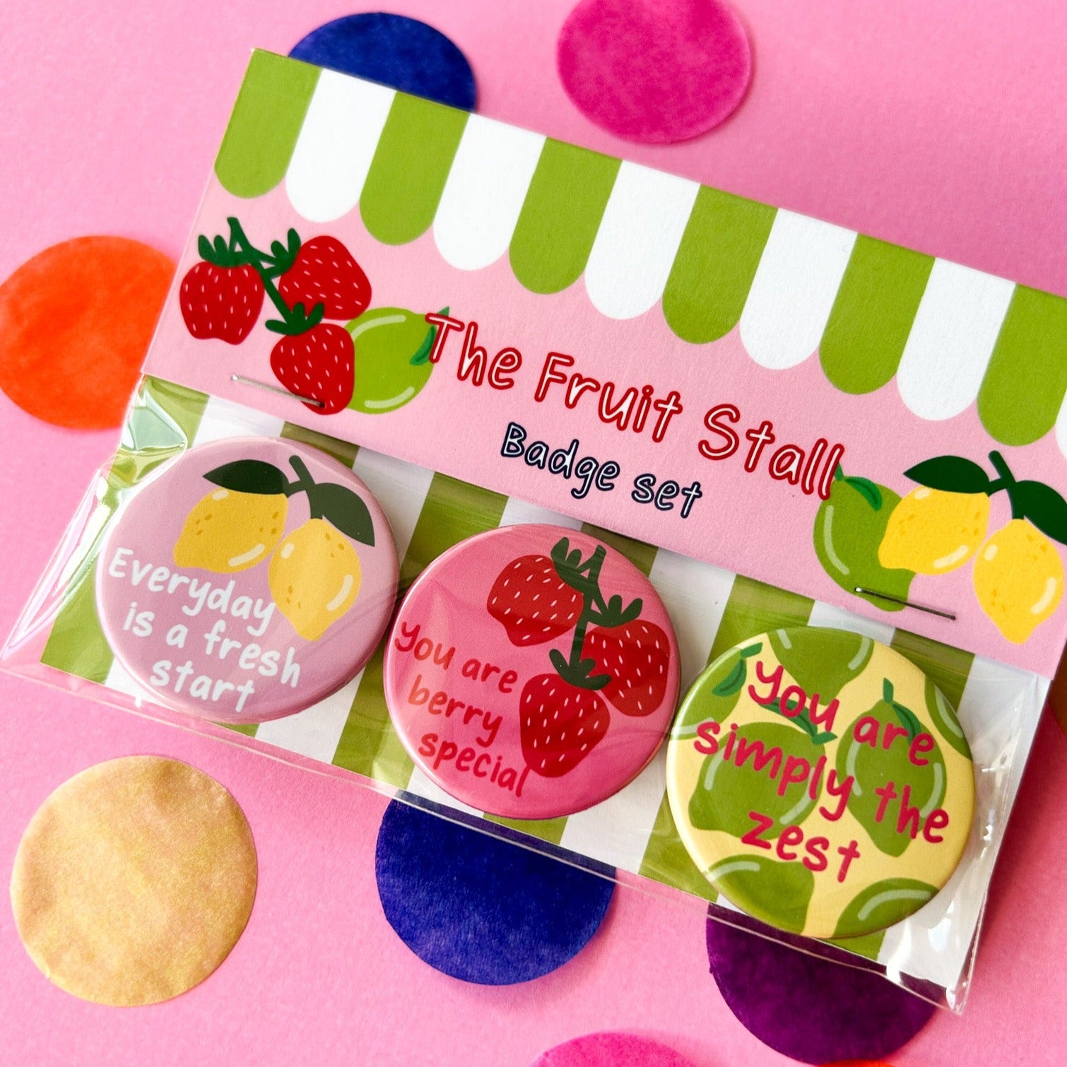 A fun bright fresh badge set with lemons, strawberries and limes. Included 3 fun fruit related badges with positive quotes.