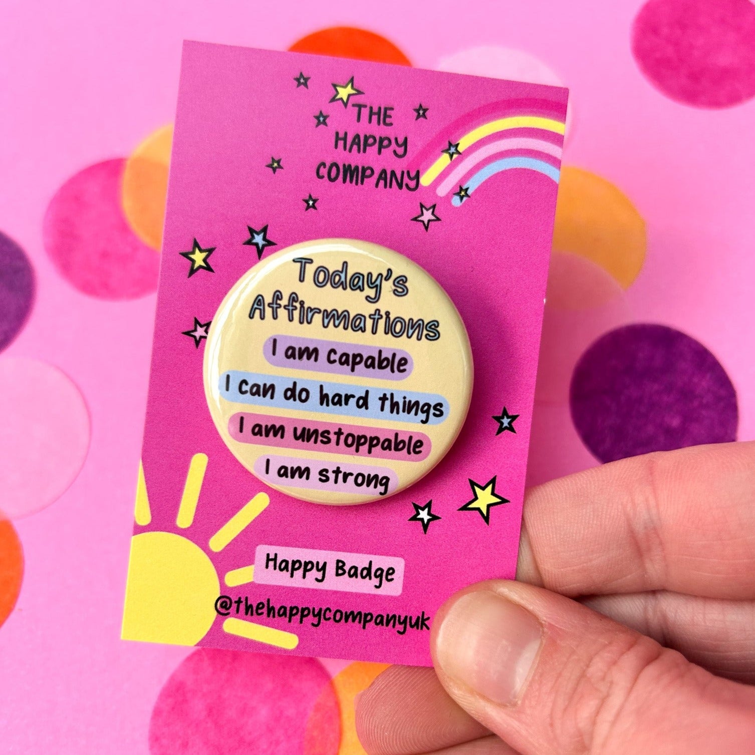 Let Today's Affirmations Badge be your daily reminder to practice positive affirming mantras for a boost of self-confidence. Wear it with pride and talk yourself up! 🙌